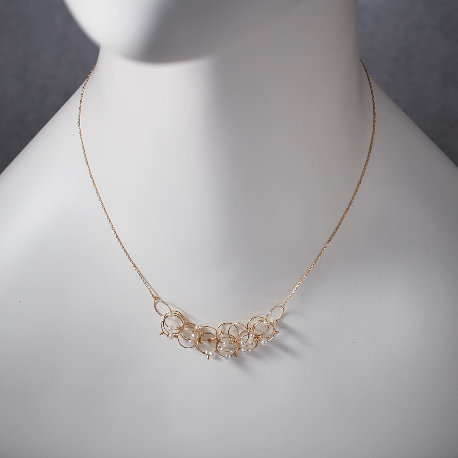 一つ一つ手作りで仕上げられたこのネックレスは、淡水パールが重なり合い、光を受けて美しく輝きます。